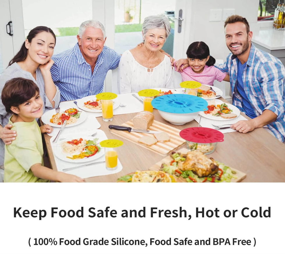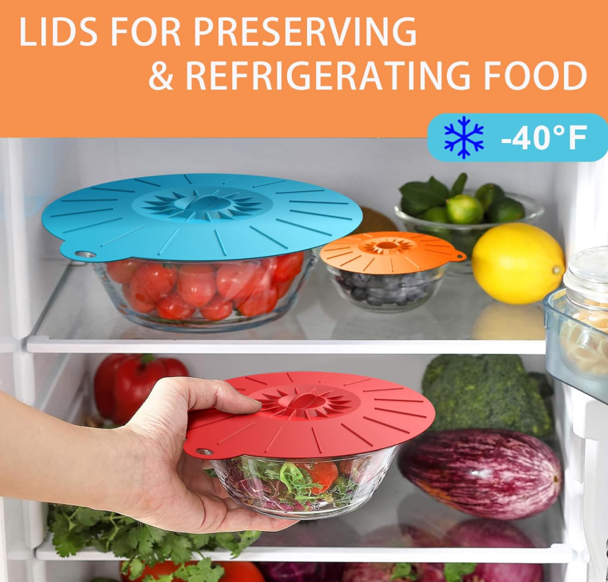 【Easy and Fun to Use】:Simply Place Lid on Pots, Pans, Bowls, Plates, Cups, Jars and Other Containers and Gently Press for an Airtight, Leak-Proof Suction Seal. Gently Lift Edge or Slide off to Release Seal.